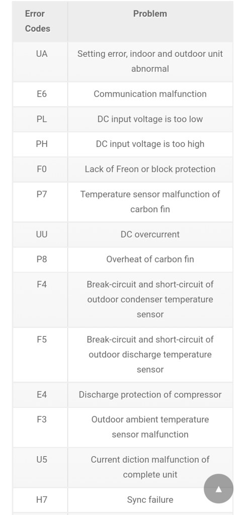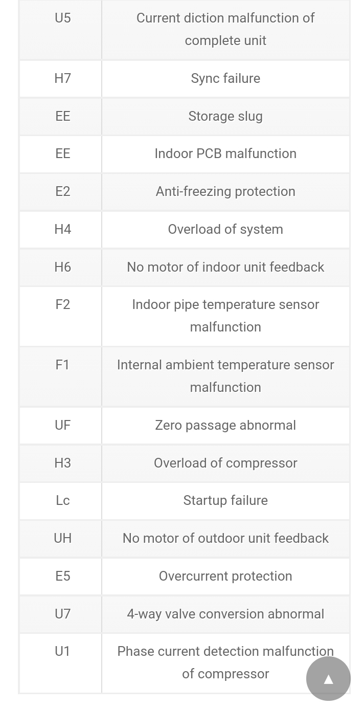 خطای UAS تنظیم ، واحد داخلی و خارجی غیر عادی E6 نقص ارتباطی ولتاژ ورودی PLDC بسیار کم است ولتاژ ورودی PHDC بسیار زیاد است F0 کمبود فرئون یا حفاظت از بلوک P7 خرابی سنسور دما در باب کربن UUDC جریان بیش از حد P8 گرمای بیش از حد کربن F4 مدار شکستن و اتصال کوتاه سنسور دمای خارج و اتصال کوتاه F5 از دمای تخلیه فضای باز حفاظت sensorE4Discharge از compressorF3Outdoor دمای محیط سنسور malfunctionU5Current نقص طرز بیان از کامل unitH7Sync failureEEStorage slugEEIndoor PCB malfunctionE2Anti یخ protectionH4Overload موتور systemH6No از واحد های داخلی درجه حرارت لوله feedbackF2Indoor سنسور دمای محیط malfunctionF1Internal سنسور malfunctionUFZero عبور abnormalH3Overload موتور compressorLcStartup failureUHNo از واحد در فضای باز feedbackE5Overcurrent protectionU74 سوپاپ سوئیچ غیر عادی U1 فاز خرابی تشخیص جریان کمپرسور